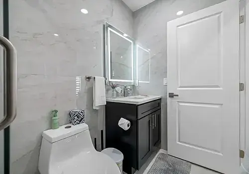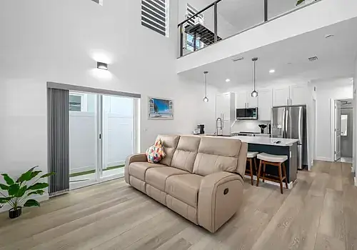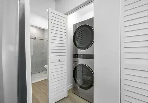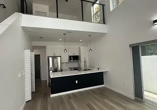 This one-bedroom, two-bathroom loft features both a first and second floor, providing a townhouse-like layout. Residents can access the apartment either from the main entrance on the first floor or directly from the second-floor hallway, offering flexible entry points.