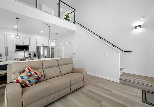 Like Apartment 1, this unit has dual access points: entry from the street into the main level, or from the second floor into the hall, where you can head up to the rooftop lounge, or down to the garage and main room.